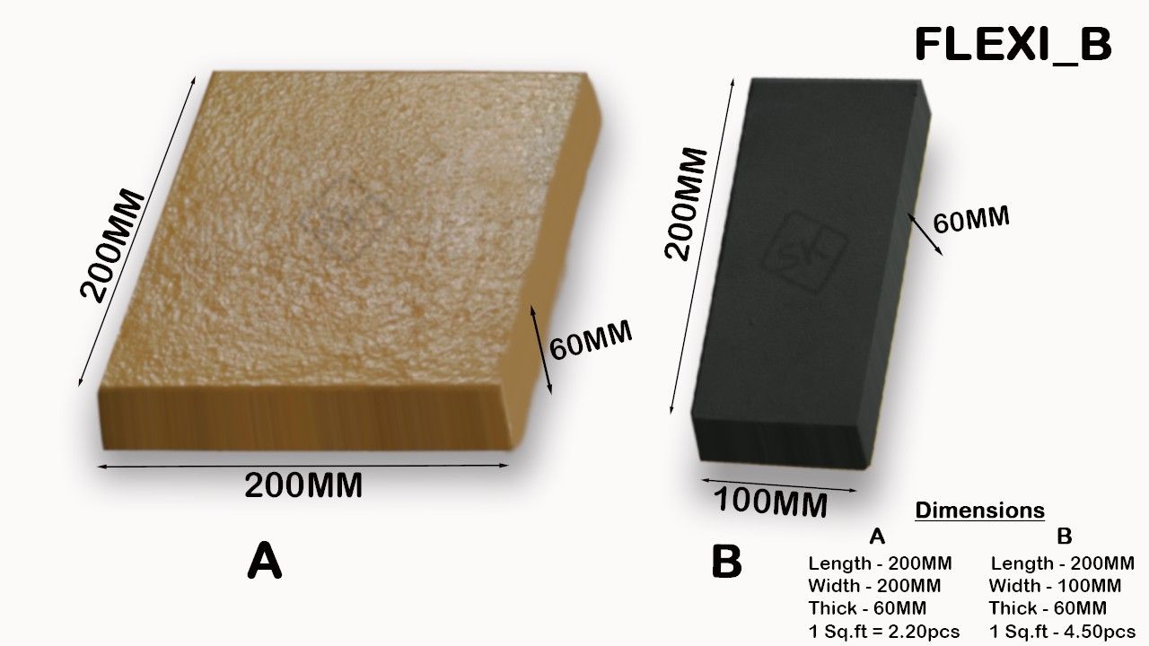 | Flexi_1B Paver Block | 200 x 200, 100 x 200 | 60 | 5.5 - 2.6 | 150 |