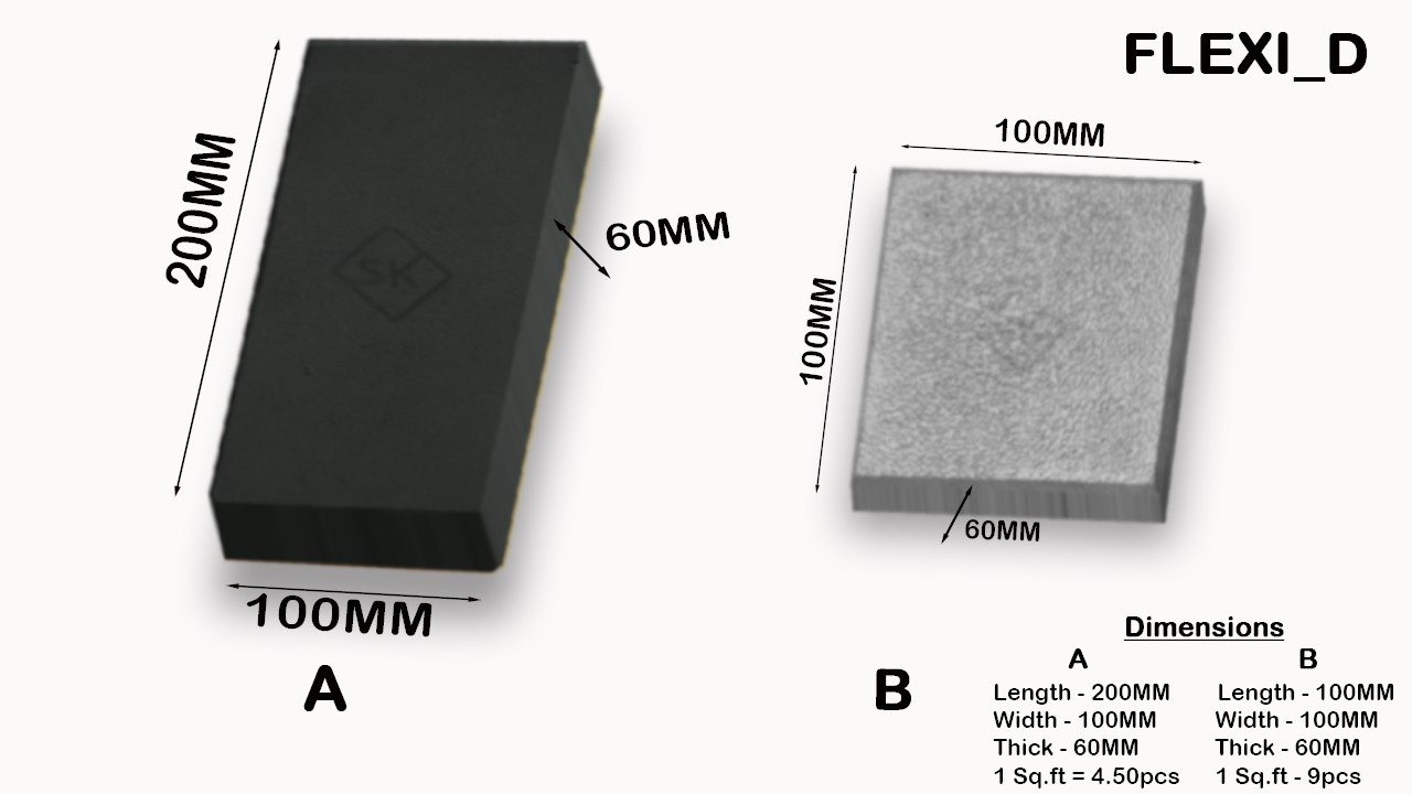 | Flexi_1D Paver Block | 100 x 200, 100 x 100 | 60 | 2.6 - 1.4 | 300 |
